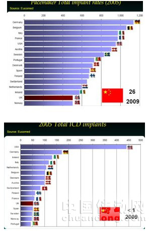 我國的植入式器件的普及率遠(yuǎn)遠(yuǎn)低于發(fā)達(dá)國家,以心臟起搏器(Pacemaker)和心律轉(zhuǎn)復(fù)除顫器(ICD)為例,我國2009年的人均普及率,心臟起搏器是2005年美國的1/35,心律轉(zhuǎn)復(fù)除顫器是2005年美國的1/500,原因主要是診斷的落后,醫(yī)療水平的落后和昂貴的產(chǎn)品及手術(shù)費用。