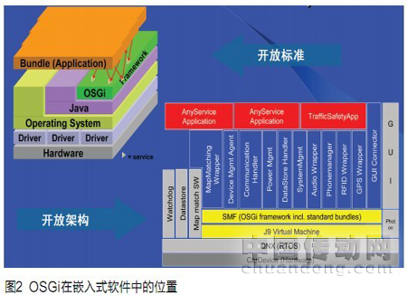 第二,嵌入式系統(tǒng)要網(wǎng)絡化。假如現(xiàn)在就把互聯(lián)網(wǎng)復制到物聯(lián)網(wǎng),這在技術上是行不通的,因為我們面向對象是數(shù)據(jù),是連續(xù)的、動態(tài)的、是非結構化的。所以瀏覽就不能簡單地設為嵌入式瀏覽器,因此需要在低端和高端之間建立信息中間件,OSGi (Open Service Gateway initiative)應運而生(圖2),是開放性的機構,專門針對汽車電子、家庭網(wǎng)絡、移動設備和工業(yè)環(huán)境等特定領域的互聯(lián)網(wǎng)中間件的應用。例如,OSGi聯(lián)盟專門成立了一個名為汽車專家組(Vehicle Expert Group)的特別機構,為OSGi在汽車電子領域的應用制定規(guī)范 。
