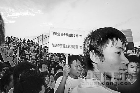 5月23日,網(wǎng)友在深圳富士康龍華園區(qū)外舉牌抗議,稱不滿富士康“十連跳”后給出的“員工個(gè)人原因”的說法,希望找出真相,阻止“第11跳”,一時(shí)引來眾多富士康員工圍觀。但就在時(shí)隔2天的5月25日早上,富士康又傳員工墜樓噩耗。