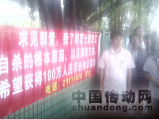 該人士自稱是一位文秘,喜歡研究社會問題,他在拉起的橫幅中稱:“求見郭董,我了解富士康員工自殺的根本原因、以及解救方法,希望獲得100萬人民幣的知識獎金。”并在落款中留下了電話和姓名。