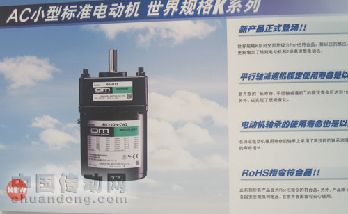 此次帶來(lái)的新產(chǎn)品——AC小型標(biāo)準(zhǔn)電動(dòng)機(jī),可與電容器連接,除了感應(yīng)電動(dòng)機(jī)、可逆電動(dòng)機(jī)等基本產(chǎn)品外,同時(shí)備有帶電磁制動(dòng)電動(dòng)機(jī)、同步電動(dòng)機(jī)、AC調(diào)速電動(dòng)機(jī)等各種產(chǎn)品。