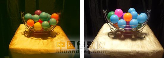 除了照度提升及節(jié)能效果外,使用LED取代高壓鈉燈的優(yōu)點還包括顯色指數(shù)的提升,以下圖為例,左圖為使用鈉燈為照明光源,由于顯色指數(shù)僅21,因此彩球的顏色無法清楚分辨。而右圖使用的光源為LED燈,彩球的顏色皆可清楚辨別。