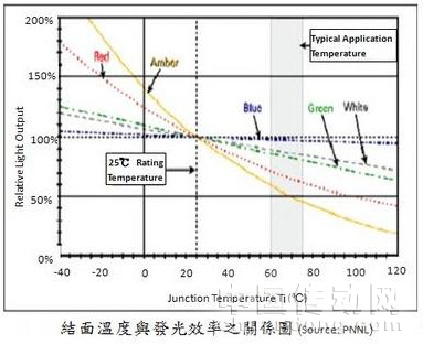 以目前的技術(shù)輸入LED的能量大約只有20%轉(zhuǎn)換為光,還有近80%的能量是以熱散出。而偏偏溫度又是影響LED輸出流明及壽命的一個很重要的變量,隨著溫度的上升,光輸出及壽命都很下降,所以散熱的設(shè)計在LED的應(yīng)用中扮演著很重要的角色。