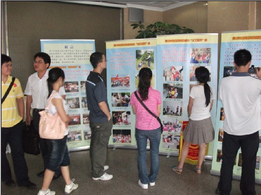 參觀完二樓的幼兒園,老師又帶我們來到了三樓,每層樓的樓道都會(huì)有很多的照片記錄下孩子們成長(zhǎng)的點(diǎn)點(diǎn)滴滴。在三樓的兩件教室里我們見到了另外一群特殊的孩子們,他們或多或少有著和正常孩子不一樣的地方。在教室里擺放著各種精致的手工藝品,老師說這些都是孩子們的杰作,這些都是老師教孩子們手編的各種布藝花、花籃等。我們隔著透明窗戶和他們打招呼,有的孩子回了一個(gè)微笑,有的卻選擇了沉默,這或許并不是他們內(nèi)心的想法,只是他們還沒學(xué)會(huì)如何和外界溝通。