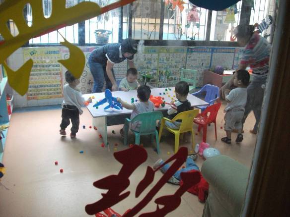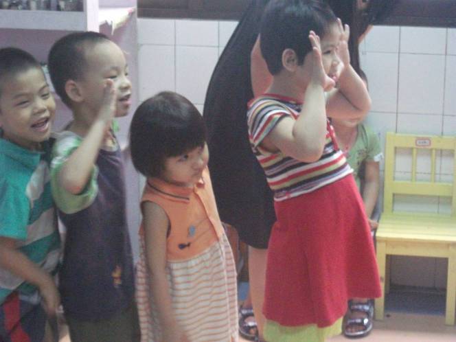 剛到福利院不久,我們又遇到了另外一支隊(duì)伍,他們是來自百安居的義工們,我們兩支隊(duì)伍在福利院負(fù)責(zé)人關(guān)老師的帶領(lǐng)下來到了福利院的二樓,這里有很多間教室,在每間教室的門口墻壁上,貼著每個(gè)孩子的簡(jiǎn)介,如孩子的姓名、年齡、性別、愛好。其中我們發(fā)現(xiàn)有些孩子的名字姓“深**”,老師說孩子們被送到福利院的時(shí)候有的不知道姓名或者剛出生就被送過來的,他們一般給孩子這樣取名。每間教室大概有10個(gè)左右的學(xué)齡前的小孩,有的老師在帶著孩子們做游戲,有的在教孩子們唱歌,為了不打擾孩子們上課,我們只是在窗戶外看著,忽然從教室中傳來了“叔叔好,阿姨好”,孩子們非常熱情地向我們招手表示歡迎,我們也笑著對(duì)孩子們揮揮手。來之前我們還擔(dān)心這里的小孩會(huì)比較內(nèi)向,但現(xiàn)在眼前的他們是如此的開朗、可愛。課間老師帶著孩子們出來,去走廊盡頭的洗手間給孩子們洗手,孩子們排著隊(duì)伍手拉手地出來,有幾個(gè)特別活潑的小朋友還在不停地向我們打招呼,我們也拉了拉他們的小手,向他們問好。另外一間教室的小朋友也有幾個(gè)探出了頭并走出教室,我們走到他們前面時(shí),小朋友們超可愛的張開小手,讓我們抱抱,我們把他們抱起,輕聲細(xì)語地試探走入他們的世界,我們還和其中的幾個(gè)小朋友留影了,和他們合影時(shí),小朋友們還擺出“V”的手勢(shì)對(duì)著相機(jī)開心地笑。在往前走,我們發(fā)現(xiàn)這間教室的小朋友們正在上英語課,給他們上課的老師是一位胖胖的美國女士,聽老師介紹,這位老師是來自國際援助中心的一名志愿者,她基本上非周末時(shí)間都會(huì)來這給孩子們上英語課,而且已經(jīng)堅(jiān)持了3、4年了,我們?cè)诮淌议T口駐足了幾分鐘,心中對(duì)這位老師充滿了敬畏。