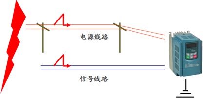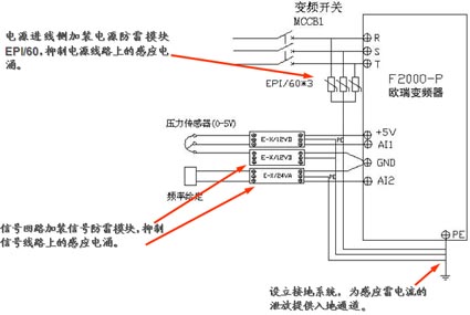 變頻器遭受的雷電危害主要來自于線路感應(yīng)的浪涌危害,包括信號感應(yīng)和電源進(jìn)線感應(yīng)。解決方案見下圖: