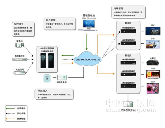 AMS多媒體信息發(fā)布系統(tǒng)是由銳目科技自主研發(fā)的一套居國內(nèi)領(lǐng)先水平,完全基于IP網(wǎng)絡(luò)的多媒體和流媒體應(yīng)用系統(tǒng)的專業(yè)級信息發(fā)布系統(tǒng)平臺。該系統(tǒng)能夠在同一平臺上編輯、處理和發(fā)布視頻、圖片、數(shù)據(jù)(文本/PPT)、動畫、網(wǎng)頁等多種媒體格式文件和播放,可以做到對不同終端的分別控制,同時可以在多種顯示終端(如:液晶、等離子電視機、CRT顯示器、視頻監(jiān)視器、背投式投影機、LED屏幕、DLP拼接墻等)發(fā)布通知、公告、圖片、廣告等信息和播放視頻、動畫等。更多詳細內(nèi)容可查看www.sharp-i.net