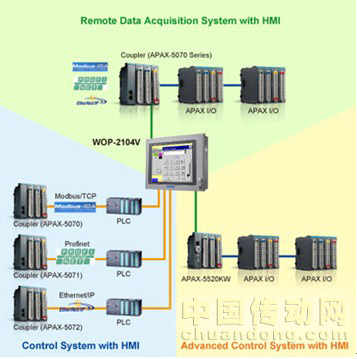 在一般的控制系統(tǒng)中,人機界面可以和PLC控制器相連接,來完成機電自動控制任務,如工廠裝配生產線上的機械控制或過程控制。研華推出了耦合模塊APAX-5070/5071/5072來擴展現(xiàn)有PLC系統(tǒng)中的I/O,它可以通過不同的協(xié)議連接APAX I/O與PLC,例如Modbus/TCP, Profinet and EtherNet/IP。PLC用戶可以通過原始的PLC開發(fā)軟件輕易地使用APAX I/O,現(xiàn)有的PLC系統(tǒng)可以輕易地通過APAX-5000遠程輸入輸出系統(tǒng)增強靈活性和可擴展性。