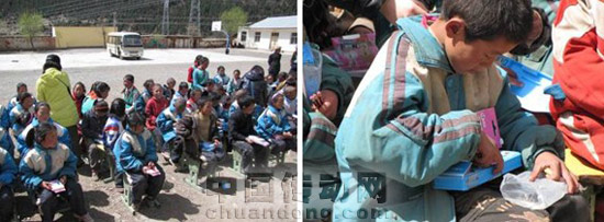 在學(xué)校操場(chǎng)上老師們已經(jīng)搭好了帳篷,孩子們搬上了板凳,整齊地坐在操場(chǎng)上等待著。25日晚,圖書(shū)剛剛抵達(dá)昌都,孩子們提前建立圖書(shū)室。