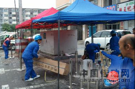 為了保證變化不影響計(jì)劃,金鳳區(qū)供電局根據(jù)施工現(xiàn)場(chǎng)實(shí)際情況,要求施工現(xiàn)場(chǎng)配置防水遮陽(yáng)棚,平時(shí)可以防暑,降雨天氣也可以保證安裝工作正常進(jìn)行,下圖為7月7日,通達(dá)南街3#、4#環(huán)網(wǎng)柜工作票許可前安裝防雨棚準(zhǔn)備施工作業(yè)。