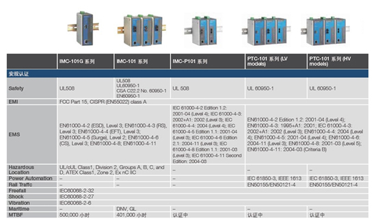 在產(chǎn)品選購過程中,請您特別關(guān)注產(chǎn)品在安規(guī)方面的認(rèn)證。由于Moxa光電轉(zhuǎn)換器是工業(yè)等級,因此會針對不同行業(yè)需求,通過各種等級的安規(guī)認(rèn)證,包括EMI、EMS、電力、交通、惡劣環(huán)境等多種認(rèn)證。而只有這樣追求卓越質(zhì)量和穩(wěn)定可靠的產(chǎn)品,才是您的最佳選擇。