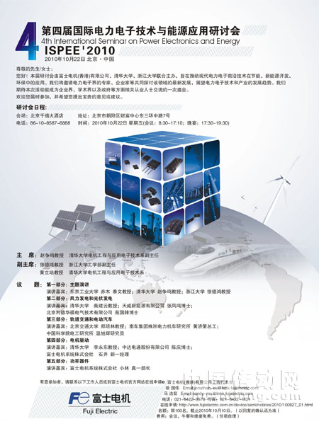 您好!本屆研討會由富士電機(香港)有限公司、清華大學、浙江大學聯(lián)合主辦,旨在推動現(xiàn)代電力電子前沿技術在節(jié)能、新能源開發(fā)、環(huán)保中的應用。我們將邀請電力電子界的專家、企業(yè)家等共同探討該領域的最新發(fā)展,展望電力電子技術和產(chǎn)業(yè)的發(fā)展趨勢。我們期待本次活動能成為企業(yè)界、學術界以及政府等方面相關從業(yè)人士交流的一次盛會。歡迎您屆時參加,并希望您提出寶貴的意見或建議。