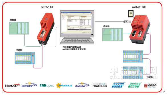 2、NT100——通用協(xié)議自由轉(zhuǎn)換網(wǎng)關,保證工廠系統(tǒng)穩(wěn)定通訊,消除不同通訊協(xié)議設備連接的障礙,不管是對于Profibus、CANopen、Devicenet、CC-Link等現(xiàn)場總線,還是PROFINET、EtherCAT、Ethernet/IP、SERCOS III、PowerLink、Modbus/TCP等實時以太網(wǎng),或者Modbus RTU、ASCII、netSCRIPT(自定義串口協(xié)議)等串口協(xié)議,NT100對各種工業(yè)網(wǎng)絡互連都提供了解決方案。