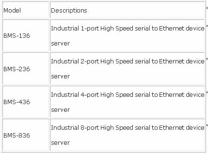 BMS-836 ensures future network expandability in order to protect an existing hardware device investment. Ethernet Direct series of Serial Device servers work with about any device with serial connectivity instantly. BMS device server family enable serial devices connected to the IP networks. Three type of serial interfaces are supported, RS232, RS422, and RS485.