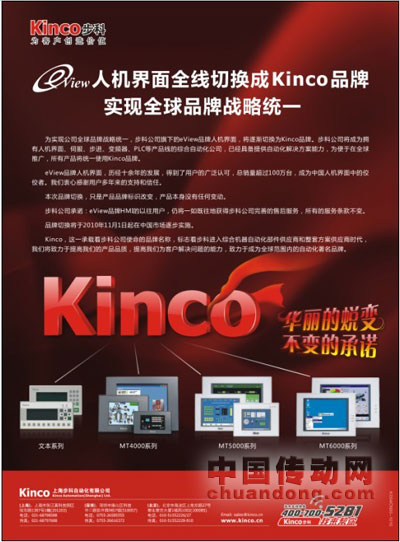 為實(shí)現(xiàn)公司全球品牌戰(zhàn)略統(tǒng)一,步科公司旗下的eView品牌人機(jī)界面,將逐漸切換為Kinco品牌。步科公司將成為擁有人機(jī)界面、伺服、步進(jìn)、變頻器、PLC等產(chǎn)品線的綜合自動(dòng)化公司,已經(jīng)具備提供自動(dòng)化解決方案能力,為便于在全球推廣,所有產(chǎn)品將統(tǒng)一使用Kinco品牌。