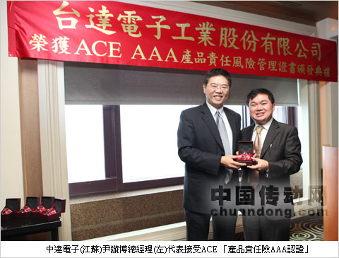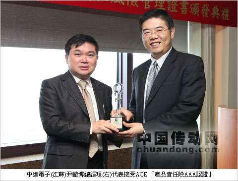 臺達電子3日獲全球最具公信力的稽核認證系統(tǒng)--美商安達產物保險公司(ACE)「產品責任風險管理AAA」認證,為亞太地區(qū)電子業(yè)唯一連續(xù)獲得此項國際級認證之企業(yè)。臺達連續(xù)叁年在「產品責任風險管理AAA」評鑑的11項指標均獲得AAA滿分肯定,顯示臺達在經營者責任風險管理、產品設計及製造、品質保證、產品安全、內部稽核等指標達到世界級最高標準。繼2008年臺達電子(東莞)、2009年泰達電子,2010年中達電子(江蘇)獲得此項認證的肯定。