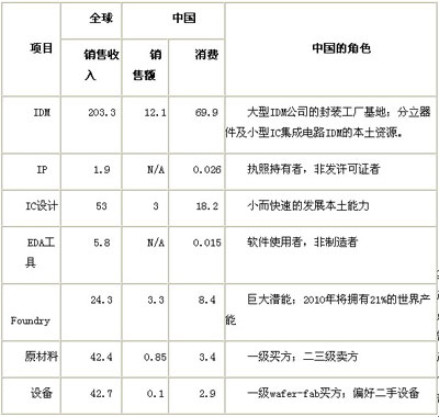 表一,全球集成電路產(chǎn)業(yè)價值鏈創(chuàng)造中中國的位置(2007)(單位:十億美元)