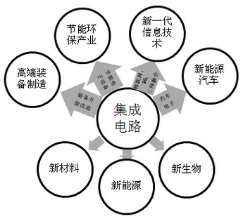 戰(zhàn)略性新興產(chǎn)業(yè)是整個國民經(jīng)濟發(fā)展的基礎(chǔ);集成電路產(chǎn)業(yè)是戰(zhàn)略新興產(chǎn)業(yè)的基石。七大戰(zhàn)略新興產(chǎn)業(yè)中四個與集成電路直接相關(guān)(見下圖);三個與集成電路產(chǎn)業(yè)間接相關(guān)。集成電路產(chǎn)業(yè)要抓住國家發(fā)展戰(zhàn)略新興產(chǎn)業(yè)的重大機遇,實現(xiàn)新一輪的騰飛。