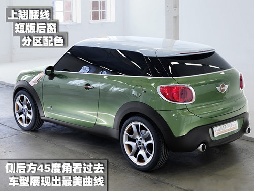 車身側(cè)后方45度角的位置,是整個(gè)車型最好看的為位置,從這里可以看出腰線上揚(yáng)的趨勢,短板尾窗特色鮮明,MINI經(jīng)典的復(fù)古分區(qū)配色也被充分的應(yīng)用在“Paceman”身上。后視鏡依舊是Q到不行的橢圓,與整體風(fēng)格渾然天成。