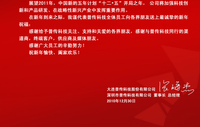 在新的一年到來之際,公司董事長兼總經(jīng)理張海杰先生回顧了過去的一年取得的不平凡的業(yè)績,代表普傳科技全體員工向給予普傳科技關(guān)注、支持和關(guān)愛的各界朋友及與普傳科技同行的渠道商,終端客戶,供應(yīng)商及媒體等各界朋友送上最誠摯的新年祝福: