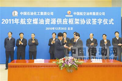 中國航油與中國石化2011年航空煤油資源供應(yīng)框架協(xié)議簽字儀式在中國石化總部舉行。集團(tuán)公司黨組成員、股份公司總裁王天普和中國航油集團(tuán)公司總經(jīng)理、黨委書記孫立出席簽字儀式。股份公司副總裁、油品銷售事業(yè)部主任張海潮和中國航油有限責(zé)任公司總裁周如成代表雙方簽署協(xié)議。