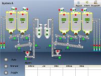 本系統(tǒng)設計包含兩個人機界面,分別用來顯示System A和System B中筒倉的料位和進出料情況以及其它各個部件的運作情況。System A由7個用來裝載OPC的筒倉和1個用來裝載PFA的筒倉組成,System B由4個用來裝載OPC的筒倉和1個用來裝載PFA的筒倉組成。