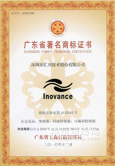 深圳市匯川技術(shù)股份有限公司榮獲“廣東省著名商標(biāo)”稱號