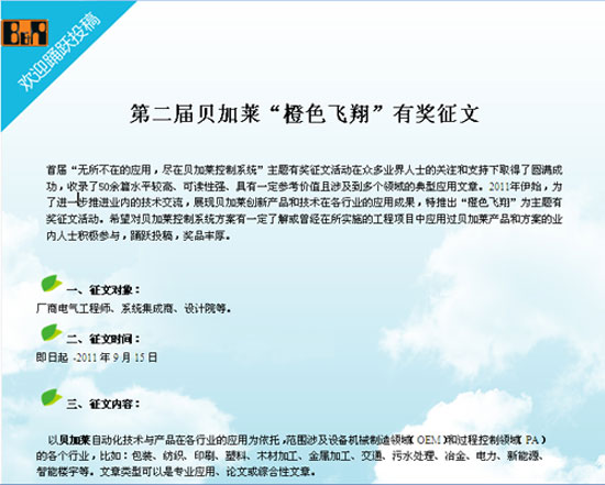 導(dǎo)語(yǔ):2011年伊始,為了進(jìn)一步推進(jìn)業(yè)內(nèi)的技術(shù)交流,展現(xiàn)貝加萊創(chuàng)新產(chǎn)品和技術(shù)在各行業(yè)的應(yīng)用成果,特推出“橙色飛翔”為主題有獎(jiǎng)?wù)魑幕顒?dòng)。