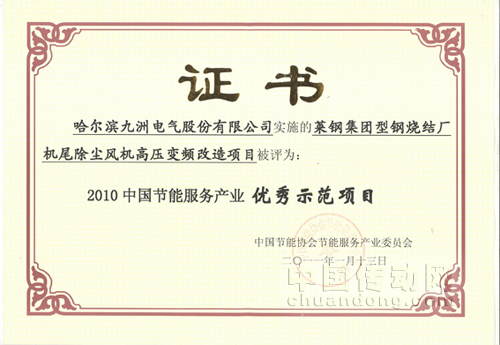 導(dǎo)語(yǔ):近日,從北京方面?zhèn)鱽?lái)喜訊,哈爾濱九洲電氣股份有限公司實(shí)施的萊鋼集團(tuán)型鋼燒結(jié)廠機(jī)尾除塵風(fēng)機(jī)高壓變頻改造項(xiàng)目被中國(guó)國(guó)節(jié)能服務(wù)產(chǎn)業(yè)委員會(huì)(EMCA)評(píng)為“2010中國(guó)節(jié)能服務(wù)產(chǎn)業(yè)優(yōu)秀示范項(xiàng)目”。