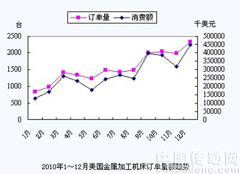 2月14日,美國制造技術協(xié)會(AMT)和美國機床分銷商協(xié)會(AMTDA)公布了美國機床消費額的最新統(tǒng)計數(shù)據(jù)。2010年1~12月,美國機床的累計消費額為32.36億美元,比2009年同期的17.46億美元增長了85.3%。其中,12月,美國機床訂單量為2317臺,比上月的1973臺增加了17.4%,比2009年12月的1346臺也增加了72.1%;美國機床消費總額為4.47億美元,比上月的3.17億美元增長了40.9%,比2009年12月的2.18億美元增長了104.8%。