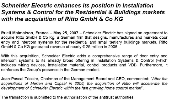 導(dǎo)語(yǔ):施耐德電氣收購(gòu)Ritto GmbH & Co KG公司