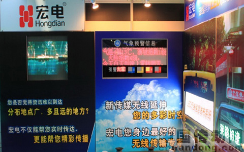 宏電公司從事無線LED信息發(fā)布已經(jīng)有好幾年的時間,素以專業(yè)著稱,特別是其3G傳輸技術(shù),更是業(yè)界首屈一指。這次帶來了無線LED氣象信息發(fā)布系統(tǒng)、無線LED出租車發(fā)布系統(tǒng)、無線LED公交車發(fā)布系統(tǒng)和全國首創(chuàng)的無線LED異步(全彩)信息發(fā)布系統(tǒng),各種特殊定制的應(yīng)用LED屏通過鑲嵌式與背景墻結(jié)合,讓所有參展客戶對系統(tǒng)應(yīng)用一目了然,對無線發(fā)布這種方式有更直觀的了解。
