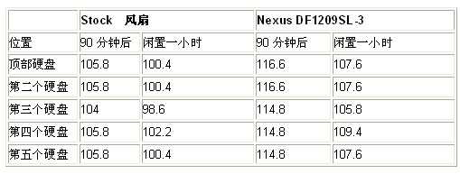 I為了看看如果使用一個(gè)帶有消音裝置的風(fēng)扇,會(huì)不會(huì)帶來(lái)溫度上的變化,我們使用了一個(gè)Nexus 92mm的DF1209SL-3風(fēng)扇代替原配的風(fēng)扇。Nexus僅會(huì)產(chǎn)生19.2分貝的噪音。它每分鐘的轉(zhuǎn)速為1500轉(zhuǎn),除非我用耳朵貼近它才可以聽(tīng)到一點(diǎn)噪音,要不然我都不確定它到底是否在運(yùn)行中。下標(biāo)列出了兩種風(fēng)扇使用情況下的溫度監(jiān)測(cè)對(duì)比表。