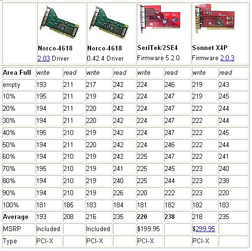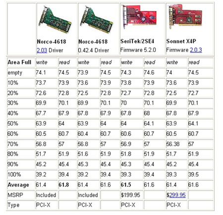 從上面的表格看來(lái), 最新的Silicon Image SiI-3124 Mac驅(qū)動(dòng)版本2.0.3并不是表現(xiàn)最好的。舊版本0.42.4速度快些,但它不支持硬盤直接連接功能,而且SILICON IMAGE已停止對(duì)舊版本的服務(wù)。有趣的是FIRMTEK公司比SILICON IMAGE公司對(duì)SILICON IMAGE的SIL3124芯片提供更快的驅(qū)動(dòng)程序,這種情形比較少見(jiàn)。