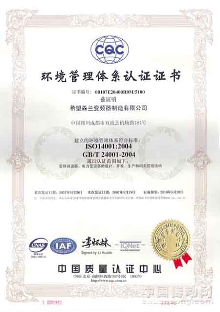 森蘭變頻通過(guò)環(huán)境管理體系認(rèn)證