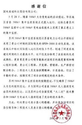 導(dǎo)語:華東首套500kV集中監(jiān)控系統(tǒng)投運(yùn) 江蘇蘇州供電公司致國(guó)電南瑞感謝信