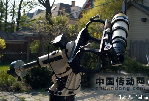 通過用流相機(jī)拍攝,F(xiàn)riedman能夠在一些簡(jiǎn)陋的拍攝條件下,錄制一些簡(jiǎn)要的清晰瞬間。使用傳統(tǒng)的相機(jī)不大可能撲捉到這些圖像。他的拍攝技術(shù)包括了掃描捕捉到的視頻,用手動(dòng)和軟件的方式選取細(xì)膩的圖像,然后將他們?nèi)诤显谝黄穑圃斐鲆粋€(gè)總結(jié)性的圖片。這張圖片從原始的數(shù)據(jù)中僅選取最好的信息。配置有索尼1/1.8" CCD的Scorpion IEEE 1394黑白相機(jī),可以以15FPS的幀速拍攝1600x1200的圖片,同時(shí)提供比DMK相機(jī)大20倍的動(dòng)態(tài)范圍。這可以使相機(jī)錄制太陽(yáng)色球?qū)拥谋砻娼Y(jié)構(gòu),同時(shí)在同樣的曝光度下提供更加朦朧的太陽(yáng)邊緣突出部分。設(shè)置感興趣區(qū)域的功能更是可以使在滿狀態(tài)下相機(jī)的下載速度達(dá)到最大化。