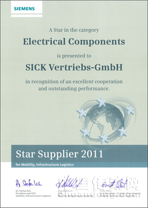 導語:2011年4月12日,SICK AG 榮獲2011年西門子交通集團最佳供應商。作為領(lǐng)先的智能傳感器產(chǎn)品和傳感器解決方案供應商