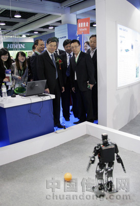 4月21日~24日(周日),第五屆中國杭州電子信息博覽會(簡稱:電博會)在杭州世貿(mào)中心隆重召開,中控研究院機器人事業(yè)部代表中控集團(tuán)深度參與本次展會,全方位展示了中控機器人的先進(jìn)技術(shù),同時,承辦了機器人足球比賽、機器人應(yīng)用研討會等系列活動。國家工信部副部長楊學(xué)山、商務(wù)部外貿(mào)發(fā)展事務(wù)局局長張超美、浙江省副省長毛光烈,杭州市市長邵占維,副市長沈堅、佟桂莉,浙江省經(jīng)信委主任謝力群、省臺辦副主任林呈生,以及杭州市發(fā)改委、經(jīng)委、信息辦、科技局、外經(jīng)貿(mào)局、臺辦,高新區(qū)(濱江)、經(jīng)濟(jì)開發(fā)區(qū)等相關(guān)領(lǐng)導(dǎo)在開幕當(dāng)天蒞臨中控展臺參觀。