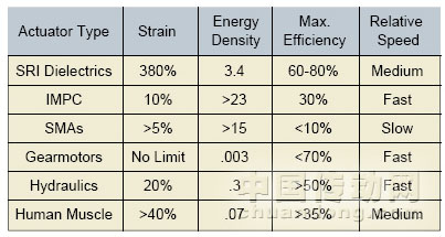 這些例子顯示出了活動(dòng)中的類人機(jī)器人原型。聚合體創(chuàng)新使得皮膚擁有更好的收縮和聚束情形,同時(shí)消耗非常少的電量,采用電池就可使輕量級機(jī)器人行走。