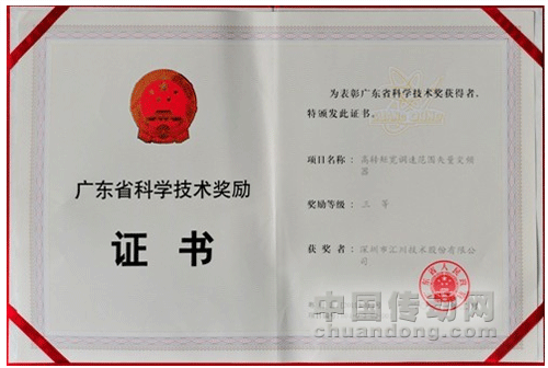 熱烈祝賀深圳市匯川技術(shù)股份有限公司“高轉(zhuǎn)矩寬調(diào)速范圍矢量變頻器”2011年1月獲得廣東省科學(xué)技術(shù)獎勵三等獎。