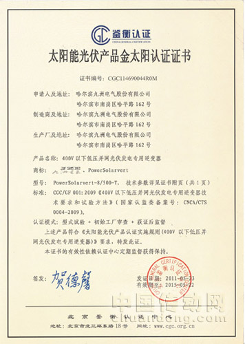 九洲電氣大功率光伏逆變器通過太陽能光伏產(chǎn)品金太陽認(rèn)證