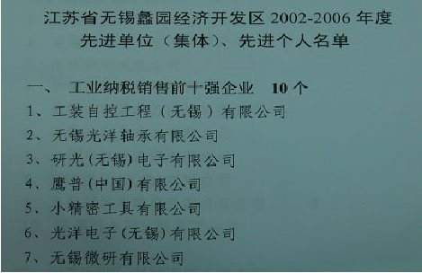 導(dǎo)語:光洋電子被評為2002年至2006年度工業(yè)納稅銷售前十強企業(yè)及稅收貢獻十佳企業(yè)。