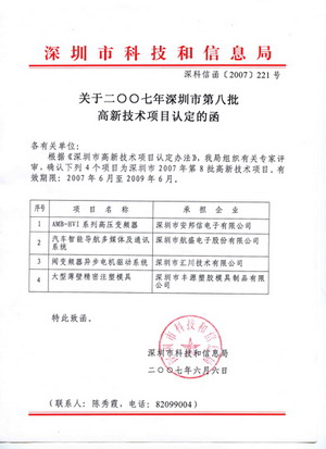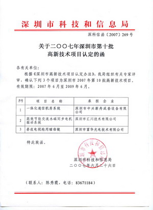 導語:我公司“閥變頻器異步電機驅動系統(tǒng)”和“高效節(jié)能交流永磁同步電機驅動系統(tǒng)”認定為深圳市高新技術項目。