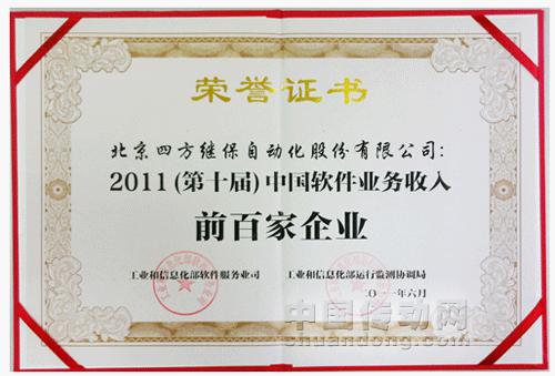 2011年6月23日,“2011年(第十屆)中國軟件業(yè)務(wù)收入前百家企業(yè)名單發(fā)布暨龍頭企業(yè)培育工作座談會(huì)”在江蘇揚(yáng)州召開。本次會(huì)議由工業(yè)和信息化部軟件服務(wù)業(yè)司、運(yùn)行監(jiān)測協(xié)調(diào)局,江蘇省經(jīng)濟(jì)和信息化委員會(huì)共同主辦,揚(yáng)州市人民政府、中國電子信息產(chǎn)業(yè)發(fā)展研究院、工業(yè)和信息化部軟件與集成電路促進(jìn)中心聯(lián)合承辦。會(huì)議發(fā)布了第10屆中國軟件業(yè)務(wù)收入前百家企業(yè)名單及我國自主品牌軟件產(chǎn)品前10家企業(yè)名單。四方股份喜獲“2011(第十屆)中國軟件業(yè)務(wù)收入前百家企業(yè)”稱號(hào)。