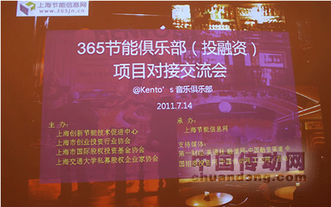 “365節(jié)能俱樂部(投融資)項目對接交流會”于2011年7月14日(周四)晚在同樂坊Kento's(健斗士)音樂俱樂部成功召開,本次會議旨在為行業(yè)內(nèi)有融資需求的企業(yè)高管、政府相關(guān)人員、銀行、租賃、擔保以及風險投資和PE等投資基金人士搭建一個相互溝通、增進了解的平臺,實現(xiàn)企業(yè)方與眾多專業(yè)投融資機構(gòu)的零距離直面對話、平等交流、專業(yè)切磋,促進企業(yè)方與投資方的充分溝通和加深了解,最終實現(xiàn)互惠共榮的可持續(xù)發(fā)展。
