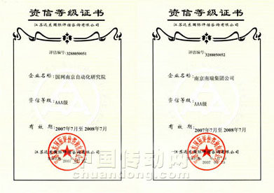 導(dǎo)語(yǔ):國(guó)網(wǎng)南京自動(dòng)化研究院和南京南瑞集團(tuán)公司新一年度資信均為最高等級(jí)AAA(有效期1年至2008年7月)。