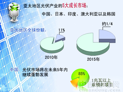 日前,美國(guó)Solarbuzz市場(chǎng)咨詢公司發(fā)布了一份名為《亞太地區(qū)主要光伏市場(chǎng)》的報(bào)告,報(bào)告分析稱,亞太地區(qū)的太陽(yáng)能產(chǎn)業(yè)正以較快的速度發(fā)展著,預(yù)計(jì)到2015年全球約1/4的需求來(lái)自亞太,2010年亞太地區(qū)的全球份額僅為11%。