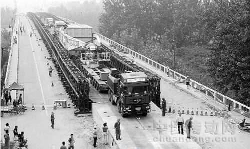 重達345噸的重物走高速、過橋并不是一件容易的事情,每走一步都需要上百人指揮和鋪路,如交通部門提前摸查路線,對沿途路橋進行加固,路過周口的東沙河“橋上橋”,更是專門鋪道行駛。
