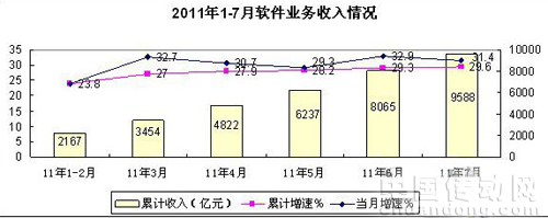 從工信部網(wǎng)站上發(fā)布的“2011年1-7月全國軟件經(jīng)濟(jì)運(yùn)行情況”了解,今年以來,我國軟件產(chǎn)業(yè)呈現(xiàn)持續(xù)快速發(fā)展態(tài)勢,月均增速保持在30%左右,收入規(guī)模接近萬億元,信息技術(shù)服務(wù)增勢突出,產(chǎn)業(yè)集聚態(tài)勢明顯。